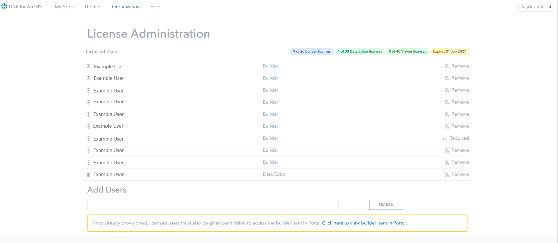 Once the licence is successfully installed, UNE must be configured to allow users access the builder and applications. This process must be completed by someone with administrative access to the portal and ownership of the UNE Builder item in the portal.