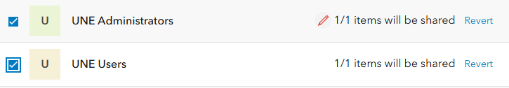 - Share the UNE portal item with the UNE Administrators group, ensuring the Shared Update option is selected.