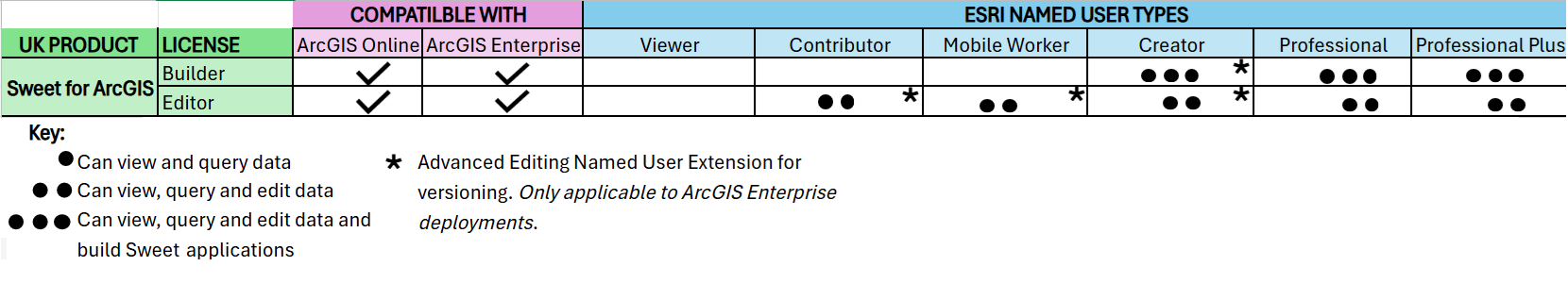 Specific ArcGIS Named User Type licenses are required to assign and use UNE licenses. The below matrix summarises the UNE capabilities enabled by each ArcGIS role-based user type.