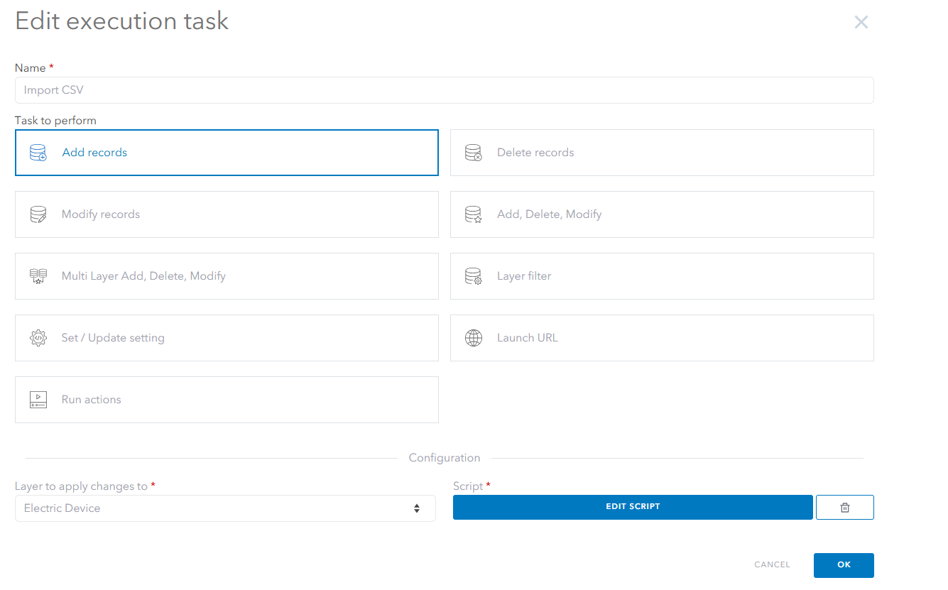 - Execution tasks can be setup in the Command panel to perform actions upon uploading of a file. For example, it is possible to take an imported CSV file and convert it into a FeatureSet with the following Arcade script.